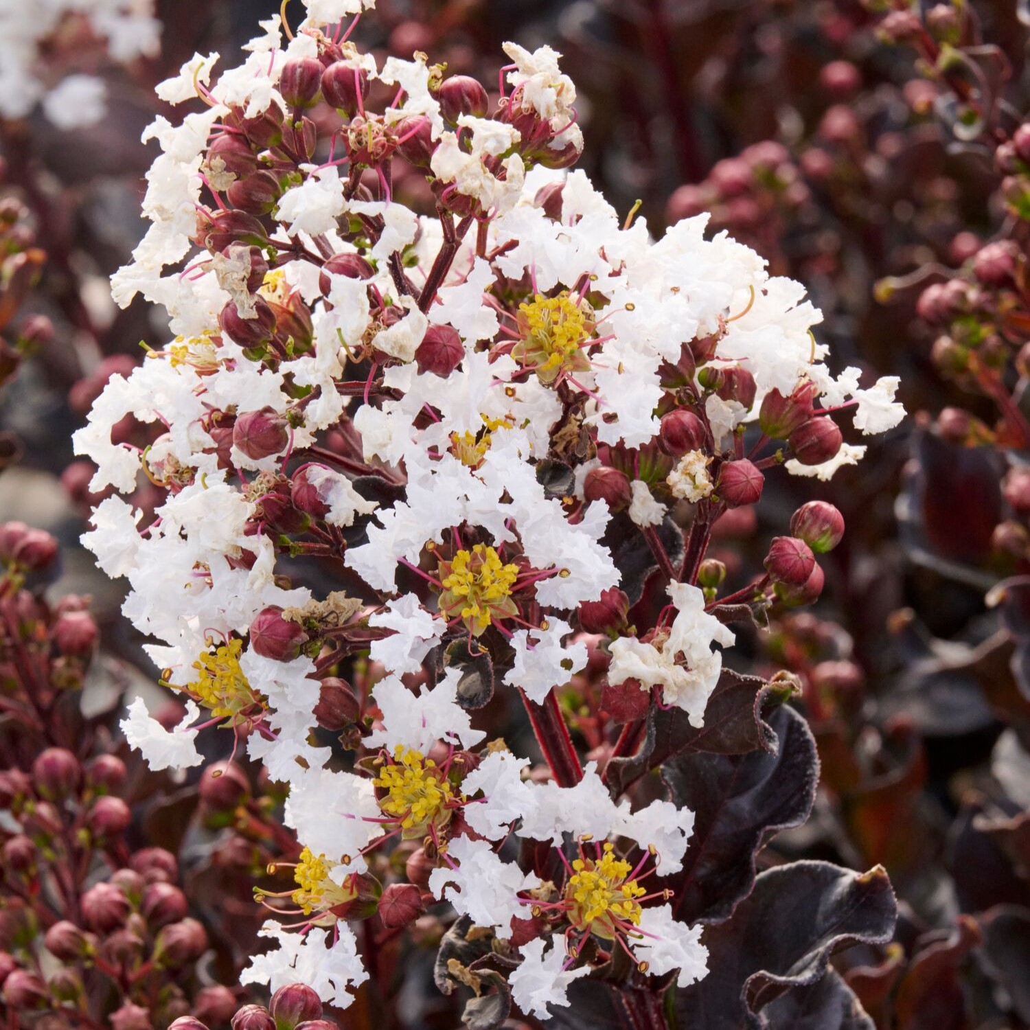 Crape Myrtles don't just tolerate heat, they need heat for the best bloom. The dark foliage of this shrub-sized variety is the perfect contrast for the white blooms. Deciduous. Full sun. Up to 3' tall and wide.