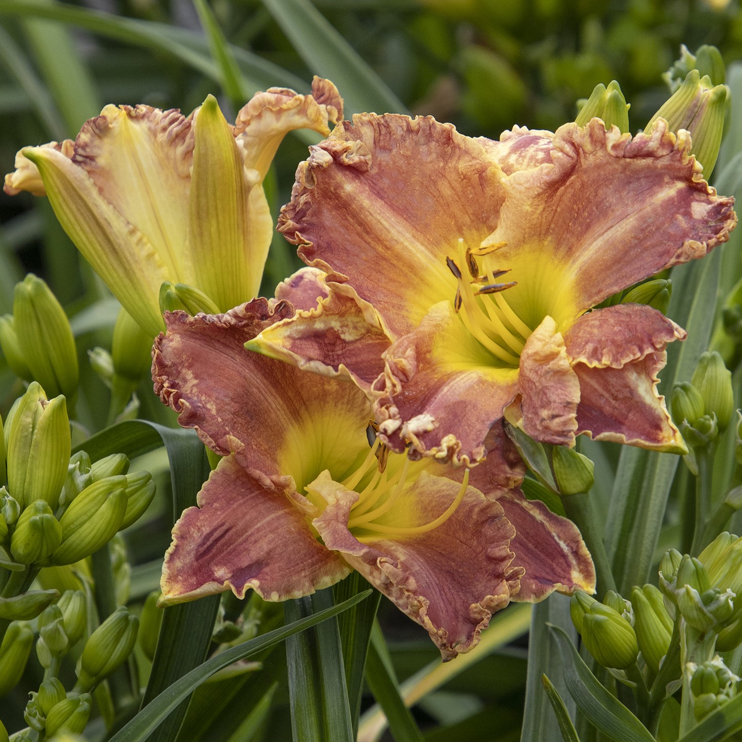 Hot, humid weather makes daylilies thrive. This easy-to-grow rebloomer features huge, frilly, burnt-orange flowers. Full sun. Up to 18" tall and wide.