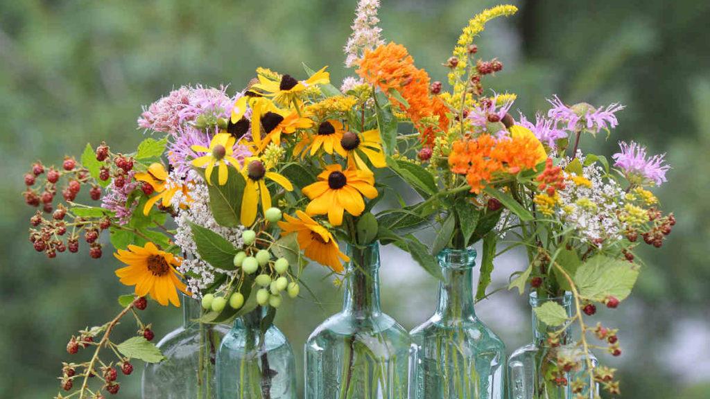 Goldstrum black-eyed Susans are the star of the early fall arrangement of blooms. Cut and tucked into a group of bottles. Clipped branches of berries and a few other flowers add loads of texture. It just doesn’t get any easier than this!