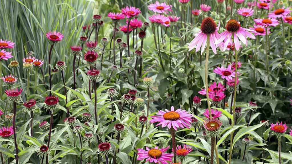 (Above–in front) The bright purple-pink, daisy-like flowers on sturdy stems make great cut flowers. Full sun. Zone: 4 – 9