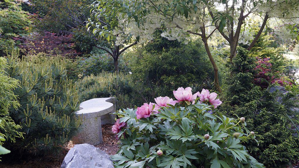 (Japanese snowbell, Chamaecyparis pisifera, Thalictrum ‘Black Stockings’ —–>)