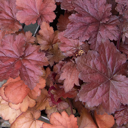 A Monrovia exclusive with lively peach and orange tones that will brighten up a dappled shade garden, and partly shaded beds and borders. Large leaves create a full, mounding plant that is exceptionally heat tolerant. Dainty flowers appear on spikes above the foliage in the spring. Partial shade to partial sun. Up to 18" tall, 15" wide. Zones 4-9.