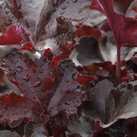 The reddest foliage to be found, with intensely colored, incised, lightly ruffled leaves on deep red stems. Foliage color is most intense in the cooler spring and fall months. Showy sprays of tiny pink buds open to white flowers in midsummer. Excellent color for borders, rock gardens, and containers.Full shade to partial sun. Up to 7" tall, 14" wide. Zones 4-9.