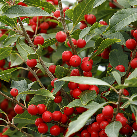 A profusion of bright red berries fall through winter is assured because a male pollenizer is planted in the same container as the fruiting female. The x meserveae species is the hardiest of the hollies with glossy, blue-green leaves and purple stems. Ideal as a landscape accent, or planted in groups as a dense hedge or screen. Partial to full sun. Up to 8' tall, 6' wide. Zones 5-9.