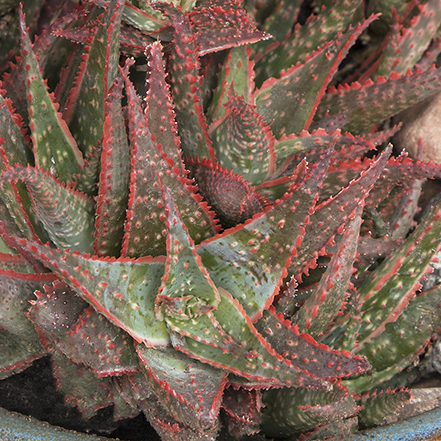 A striking succulent that has fleshy, orange-stippled, pale green foliage with bright, orange-red fringed margins. This handsome, clumping, heat and drought-tolerant hybrid performs well indoors or out. A must-have for the succulent collector! Partial to full sun. Up to 10" tall and wide. Zones 9-11.