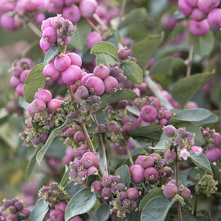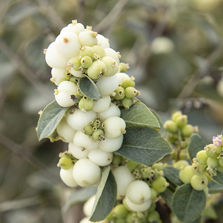 Full, leafy branches are adorned with light pink summer blooms that produce an abundance of white berries, becoming especially showy on the bare stems in winter—excellent in floral arrangements. The perfect plant in front of evergreen shrubs to spice up northern native plant landscapes and wild garden woodlands. Partial to full sun. Up to 4' tall and wide. Zones 3-7.