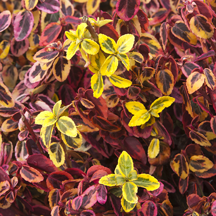 This colorful evergreen shrub sports bright green leaves with gold edges, turning pinkish red in fall and winter. Spreads by creeping stems that root where they touch the ground. Dense mounding form makes an excellent small hedge or border plant. Gently climbs with support, making a nice background or foundation planting. Full sun. Up to 2' tall and 5' wide. Zones 5-9.