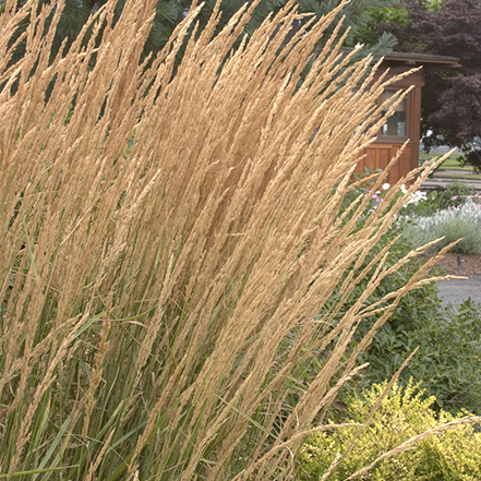 Create a stunning vertical effect with feathery stalks that emerge reddish brown in spring and turn a rich golden color in fall. Thrives in wet soils, yet tolerates drier conditions. Stalks make great cut flowers. Sterile seeds do not produce unwanted seedlings. Full sun. Up to 2' tall and wide. Zones 4-9.