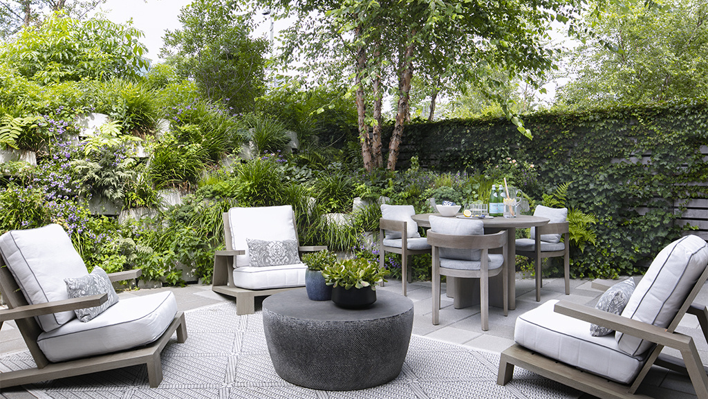 Many also noted that it felt cozy and private thanks to the natural enclosure that comes from the ivy-covered fence and unique living wall full of verdant ferns and lilyturf at the back. The shade, structure, and texture of the river birch tree act as a stately anchor to the outdoor room. It's also a great example of a hardscaped geometric floor, with square tiles and a patterned outdoor rug. Using materials like these for your outdoor room creates a living space that becomes an extension of the house.Â