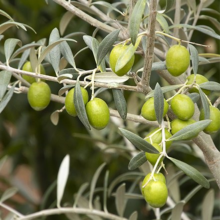 Distinguished by its large spherical olives with smaller pits, yielding more flesh than the popular Manzanillo. Evergreen foliage is more finely textured, with dense, arching branches on a more compact, rounded form. Full sun. Up to 20' tall, 15' wide. Zones 8-10.