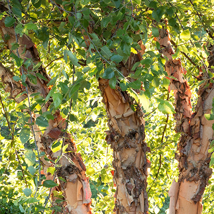 A gorgeous, multi-branched tree with textural, colorful, and peeling bark that provides striking year-round interest. An adaptable and heat-tolerant tree. Full sun. Up to 70' tall and 60' wide. Zones 3-7.