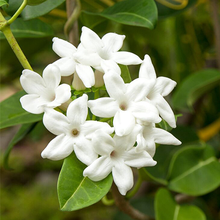 Clusters of fragrant, pure white, tubular flowers contrast nicely with the dark green, leathery leaves. This handsome vine will twine upwards with a trellis or fence support and is an excellent container plant. Partial sun. Twining stems can reach 15' long. Zones 10-11. Grow indoors in all zones.