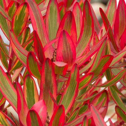 Deep red bracts surround attractive cone-like flowers top the branches from late winter into spring. A unique and colorful frost and drought-tolerant accent for minimal-care, low-water landscapes. Full sun. Up to 5' tall and wide. Zones 8-10.