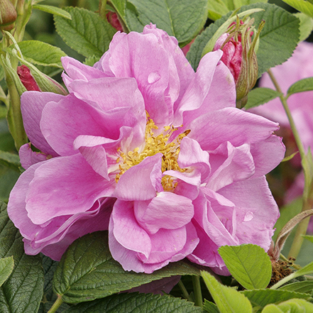 Terrific amounts of blooms on a far smaller plant than other rugosa roses. Blooms from mid-spring into fall. This extra-cold-hardy rose is tolerant of sea spray and road salt. 3’ tall and wide. Zones 3-9.