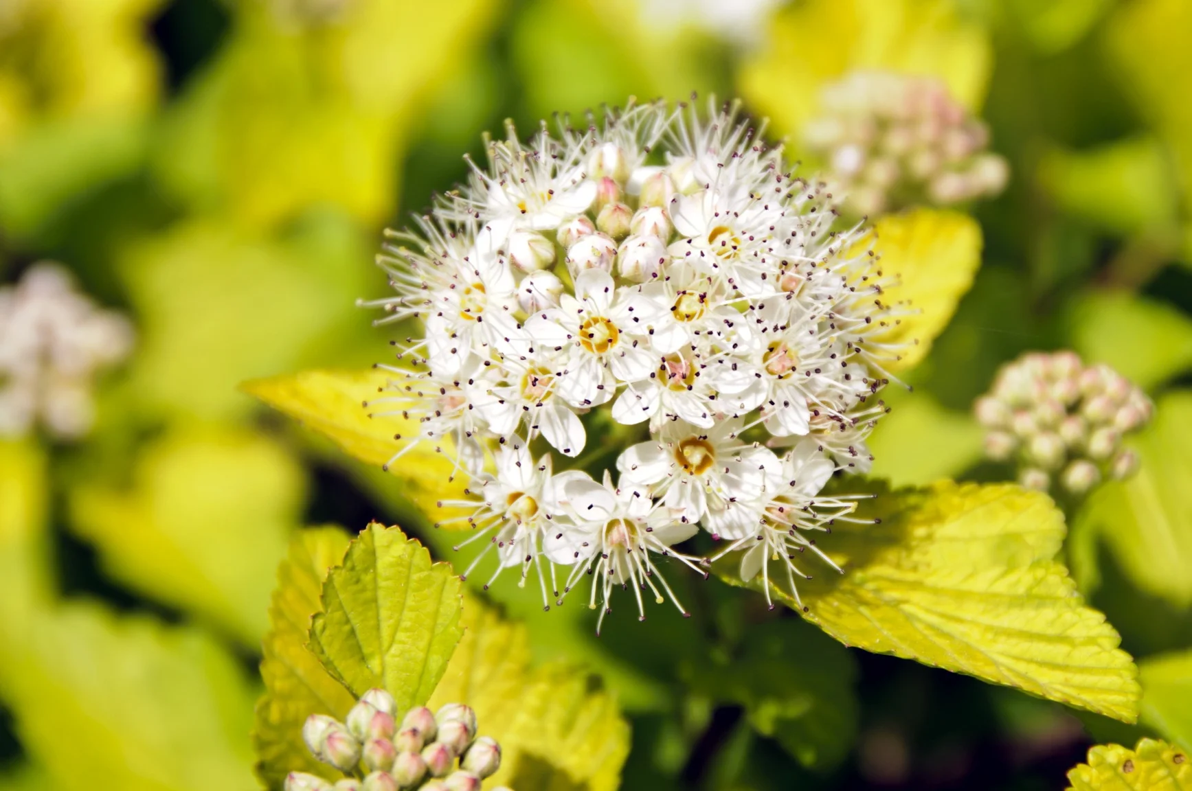 | Description | Striking foliage color on a compact, mounded shrub. Large maple-like leaves emerge bright golden yellow in spring, age to lime green, then take on a golden hue with a bronze tint in fall. Small white flowers bloom in dense clusters, followed by small red fruit. Exfoliating bark on mature branches provides intriguing winter interest. Deciduous. |