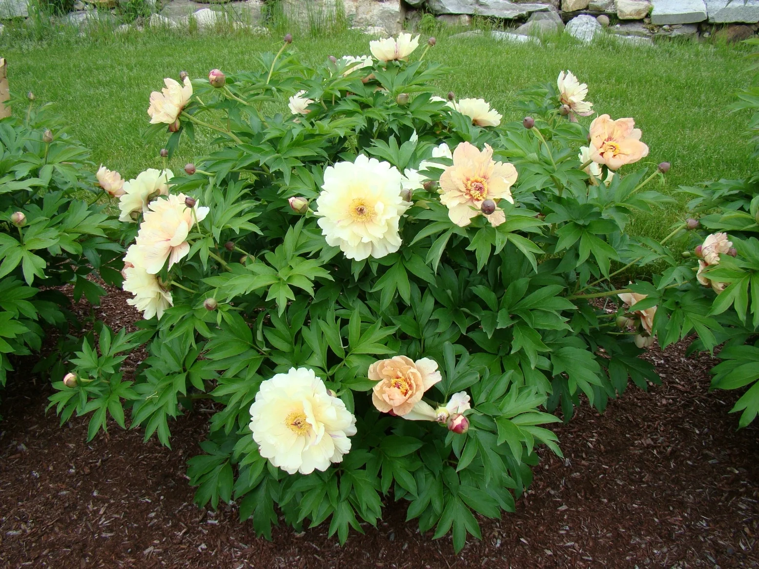 | Description | Big, double blooms with soft peachy-yellow petals feature showy flashes of magenta. Flowers are held closer to the foliage, creating a compact, rounded form that requires no staking. Mildew-resistant foliage stays attractive all season long. Perennial. |