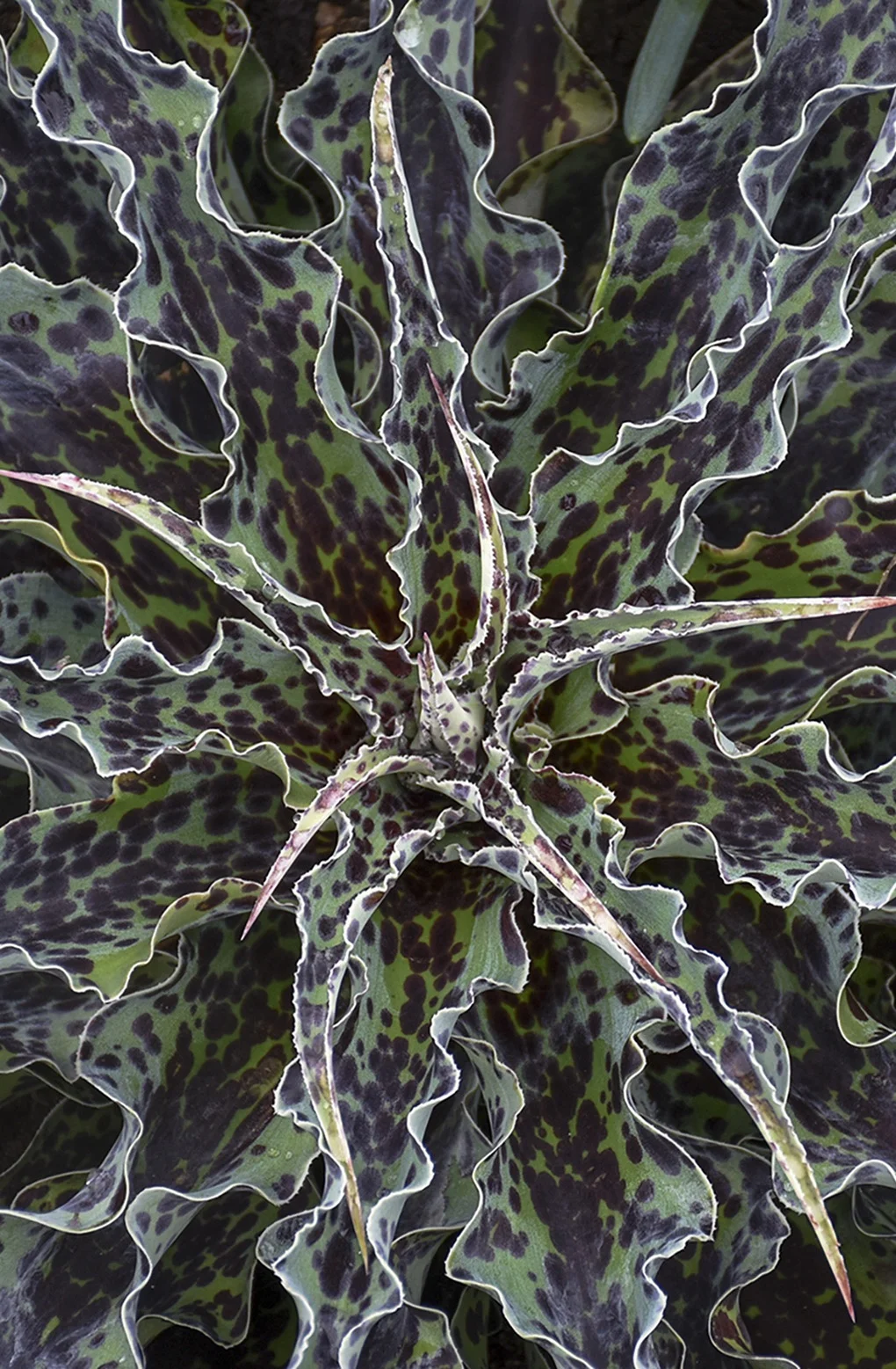 Fascinating wavy leaves are heavily dotted with chunky chocolate-brown spots. In late spring, the clumping rosettes are topped by 30-inch stalks with curious flowers, the most showy part of which is long burgundy stamens topped with yellow anthers. The low, ground-hugging habit and waterwise nature make it a perfect addition to mixed succulent containers or rock gardens. Evergreen in frost-free climates.