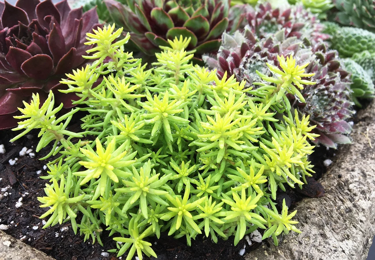 Description This mat-forming variety has been bred not to flower, keeping the mound of bright chartreuse yellow foliage attractive and tidy. Mass to create a waterwise groundcover, or use in low-water container plantings or rock gardens. Evergreen perennial.