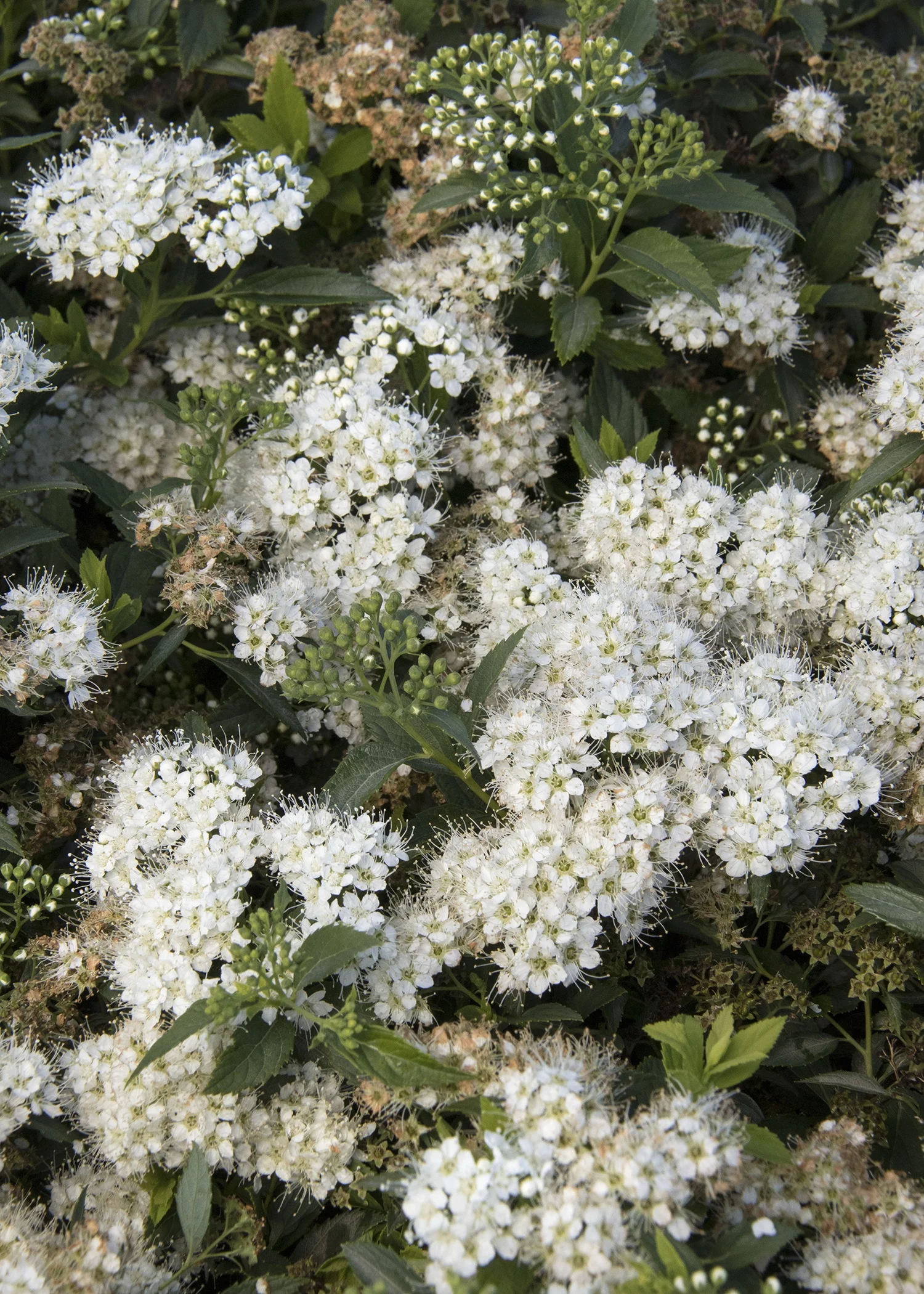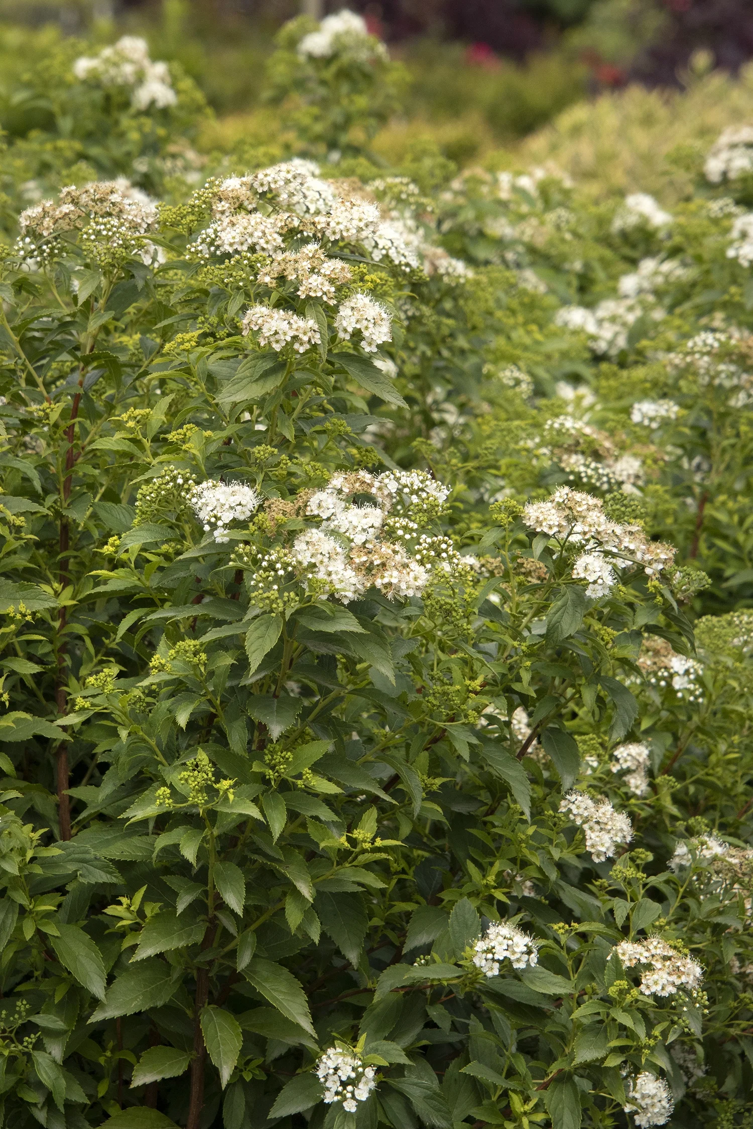 Description This compact deciduous shrub produces a profusion of showy flower clusters densely packed with small white blooms. A self-cleaning, repeat bloomer that naturally maintains a tidy appearance throughout the season, needing only a light trim midseason to promote rebloom. The smaller, mounded form is perfect for low borders or massing in the landscape.